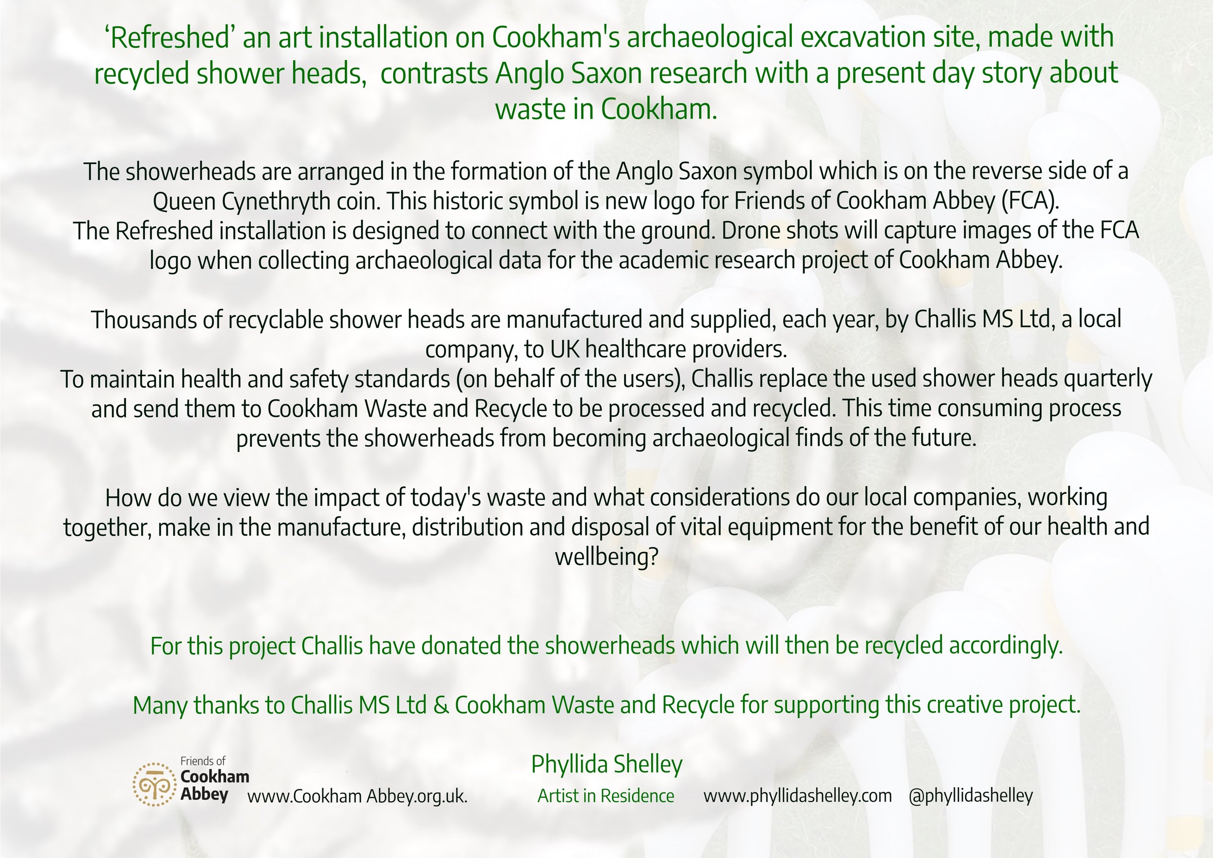 My ‘Refreshed’ art installation, designed for the excavation site, is inspired by the archaeology of Anglo Saxon & present day Cookham. It provided information about the dig and encouraged discussion around issues of archaeology and waste.